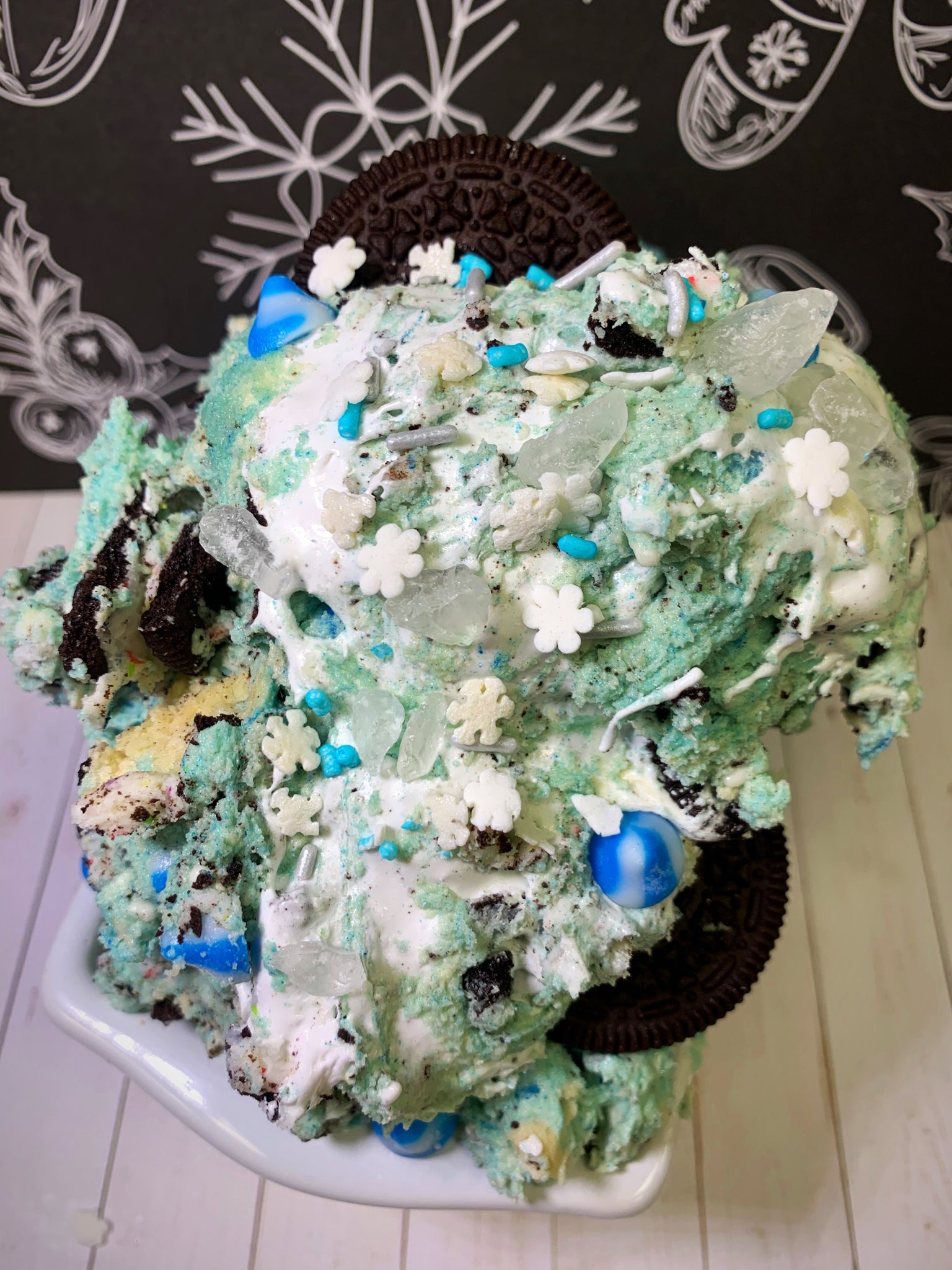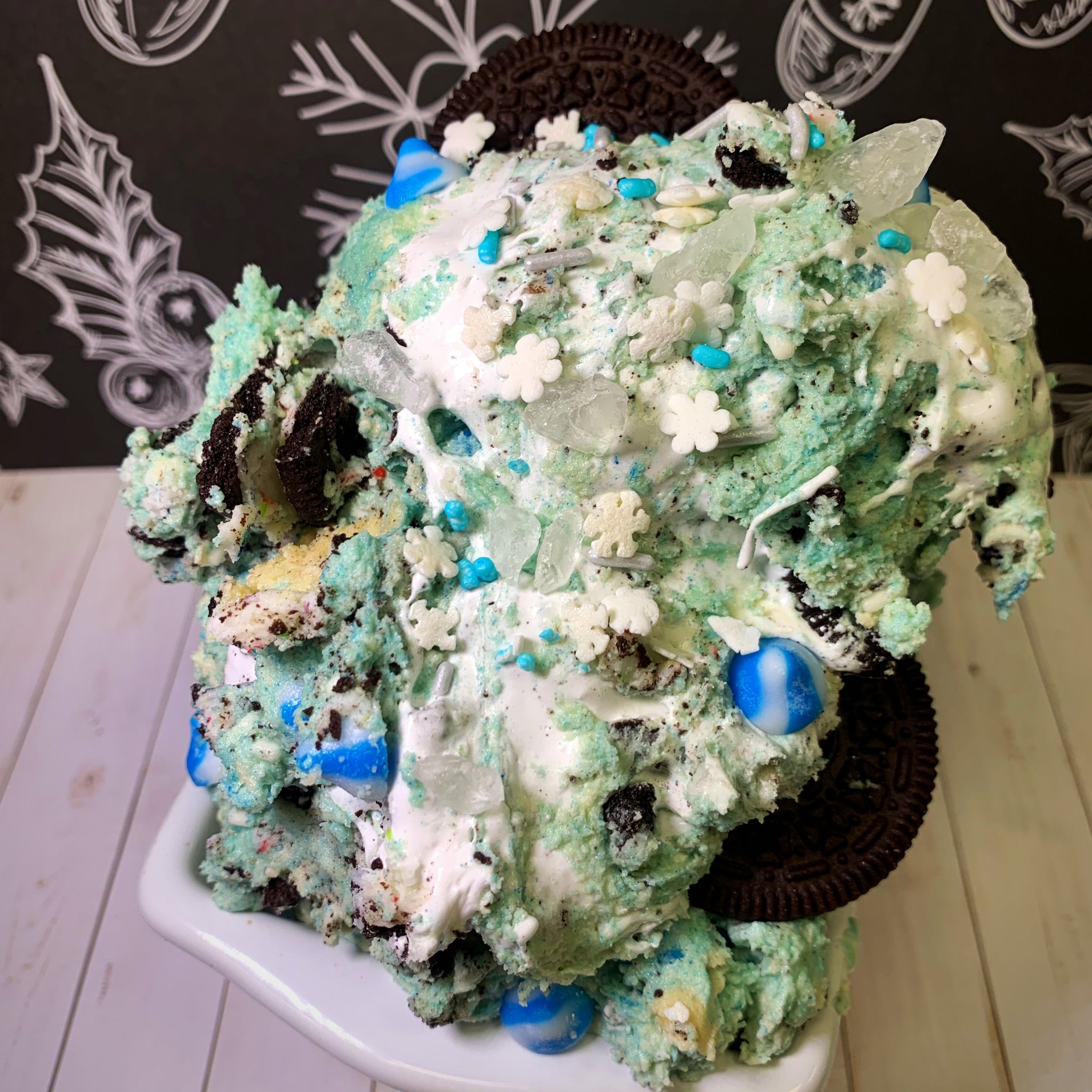 Icey blue dough base is loaded with birthday cake Oreos, vanilla chips, & swirled with our fat free gluten free fluff! Topped with an icey wintery sprinkle blend!
